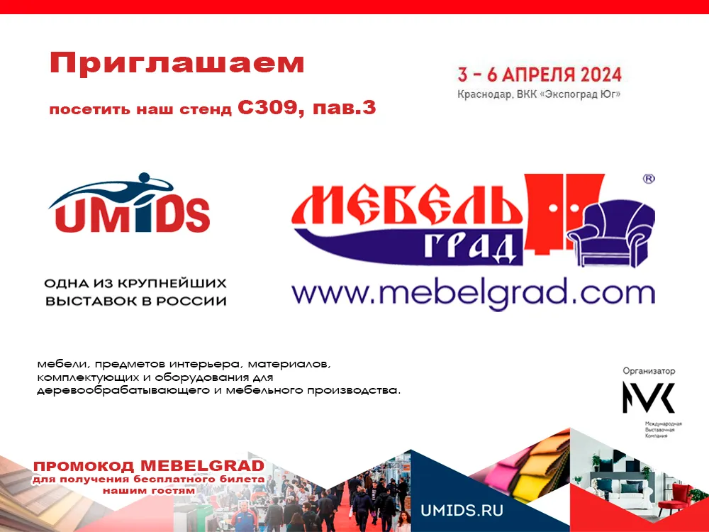 «Мебельград» приглашает на «UMIDS-2024» - 26-ю Международную выставку мебели, предметов интерьера, материалов, комплектующих и оборудования для деревообрабатывающего и мебельного производства.