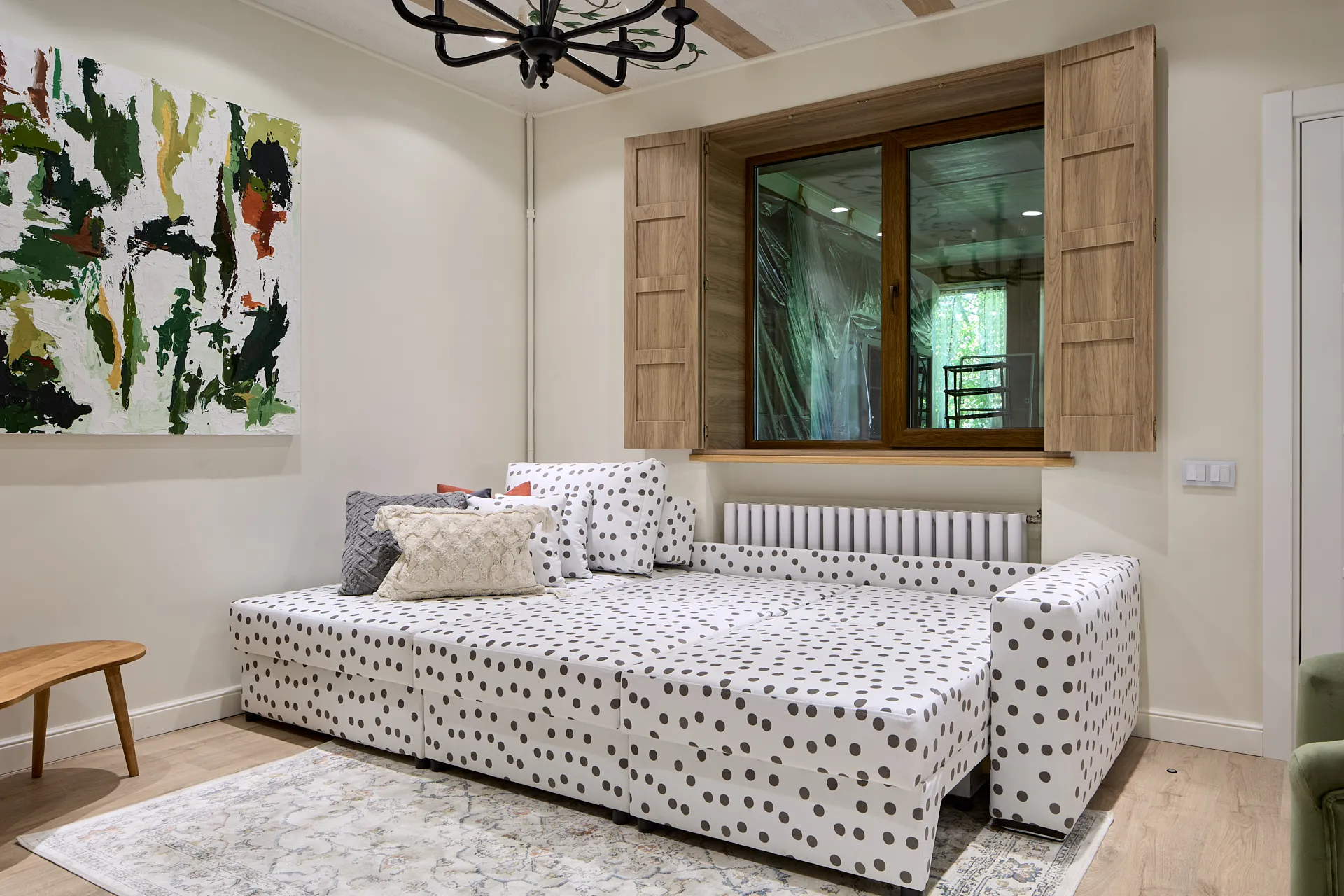 Обновление гостиной стало для героев приятным подарком, который им решила сделать сестра Дмитрия. Источником вдохновения при создании интерьера стали кованые цветы, которые украшают решетку камина героев передачи. И важной частью гостиной, естественно, стал удобный диван в обивке в горошек, как элемент деревенского стиля в современном загородном пространстве.