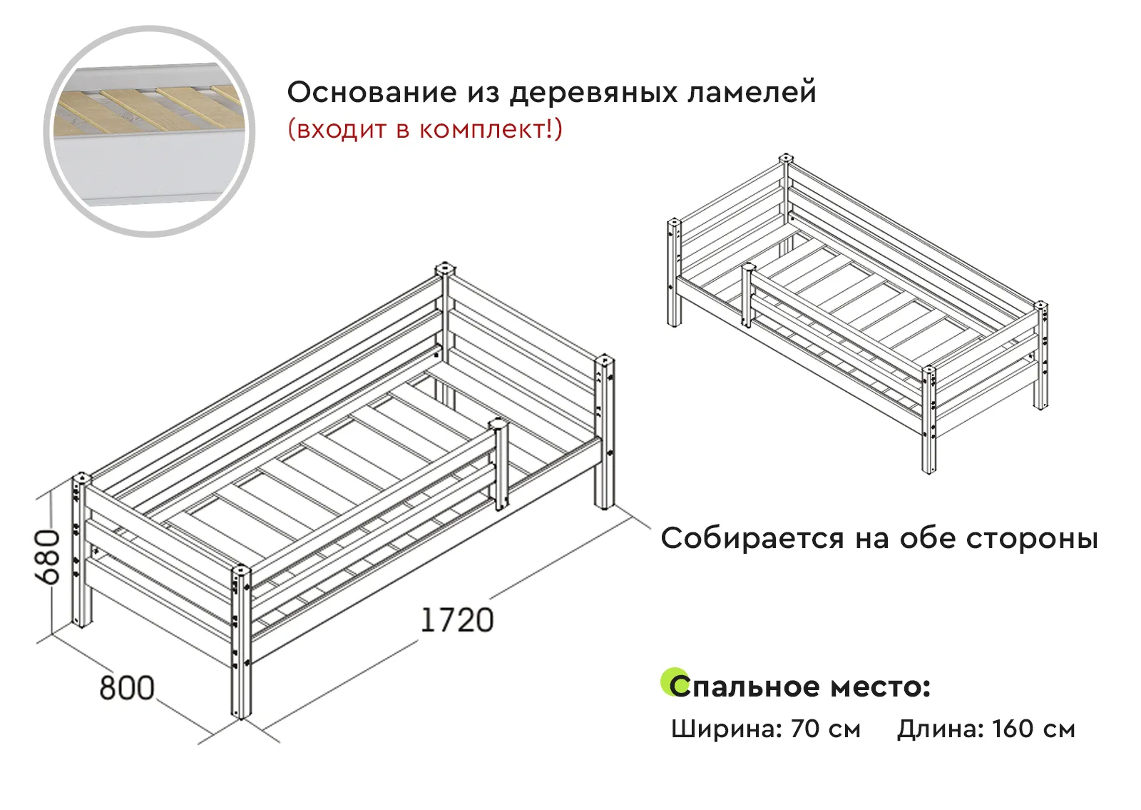Матрасное основание (комплект ламелей) входят в комплектацию кровати. Собирается на обе стороны |