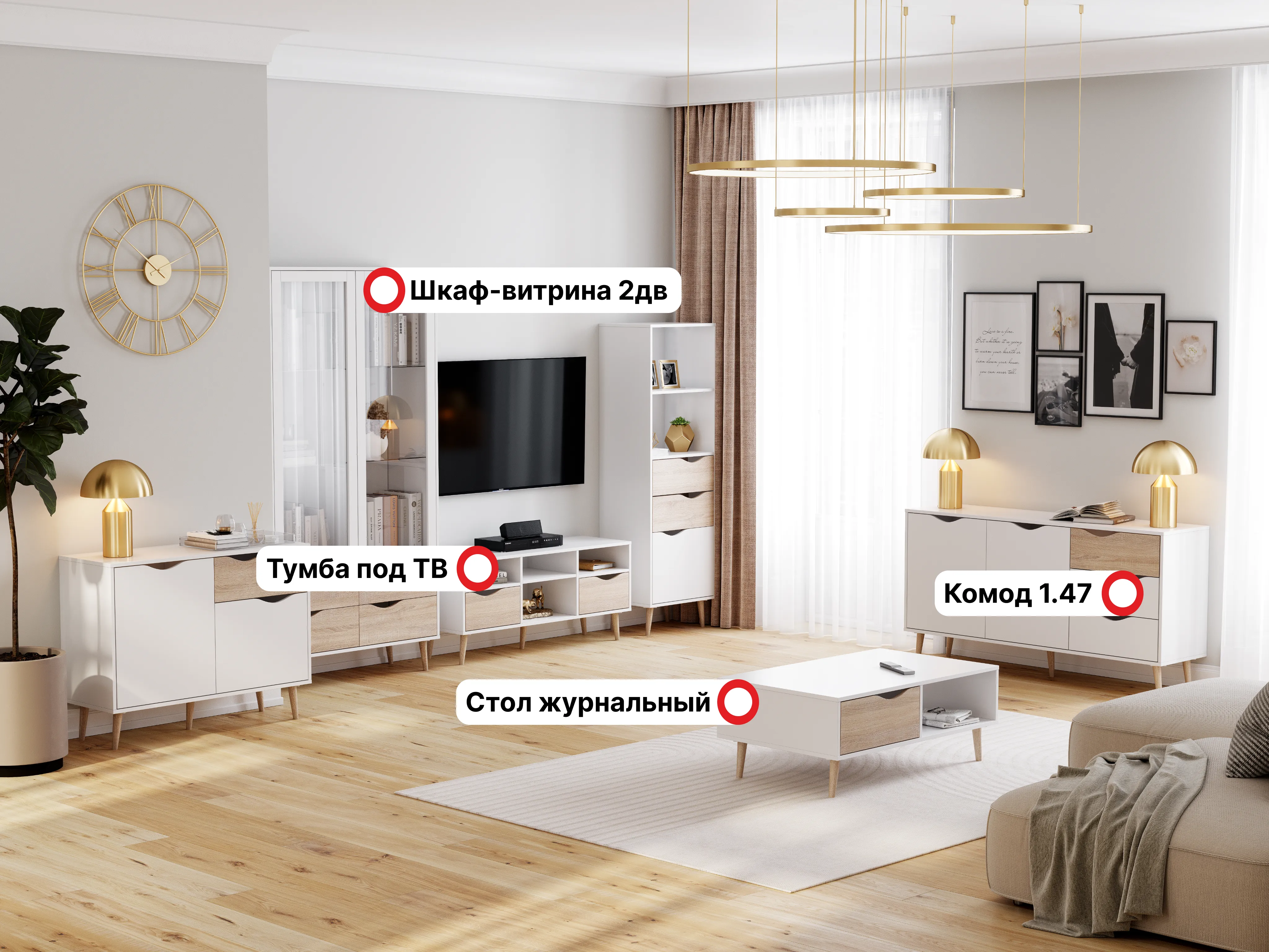 Серия «Соната» отличается простотой и натуральностью, выполнена в естественных тонах. В дизайне отчетливо улавливаются отсылки к скандинавской эстетике: чистые линии корпуса, использование белого цвета в отделке фасадов, расставленные в стороны высокие стильные опоры, выполненные из массива березы.